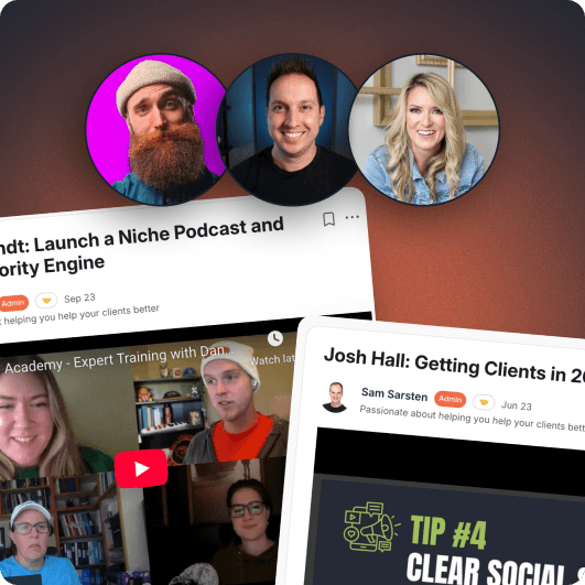 We have a growing library of trainings from industry experts dropping knowledge on client acquisition, conquering social media, overcoming pricing mindset, niching down, short form video dominance, PPC and AI SEO breakdowns, and many more schedule for the coming months.